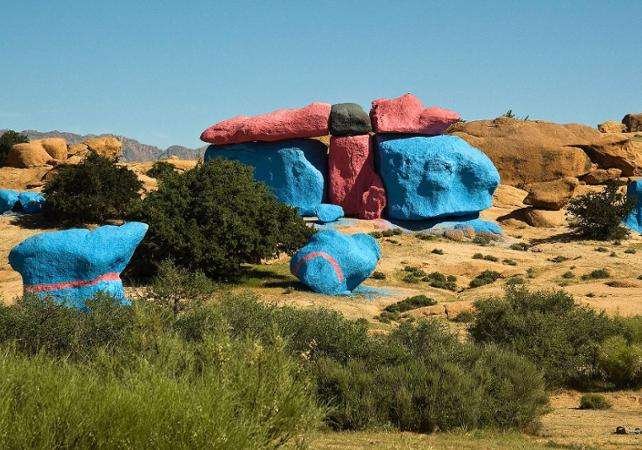 During your visit to Tafraoute, you will have the chance to meet welcoming locals and witness traditions that have been preserved for centuries. We will enjoy a traditional lunch in picturesque surroundings, set against the dramatic and imposing backdrop of the Jebel el Kest rock face. The combination of local flavors and majestic mountain views makes for an unforgettable dining experience.